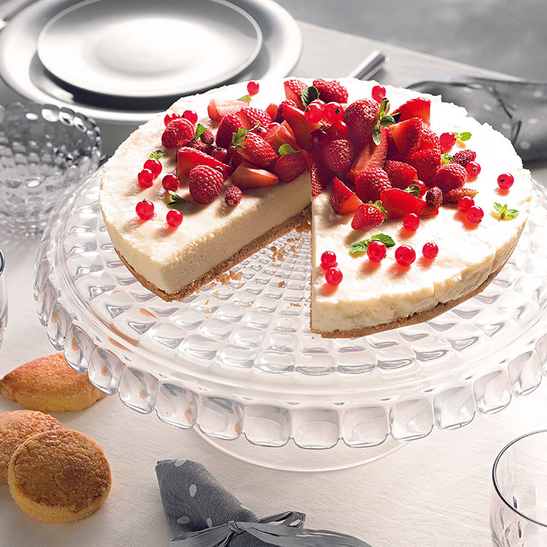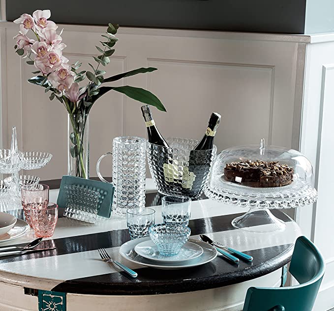 This cake stand from the "TIFFANY" collection is a standout piece that combines elegance and sophistication. With a smooth and minimalist base, it distinguishes itself with its iconic checkered relief pattern, adding a refined and exclusive touch. The transparent dome, which protects and beautifully displays the cake, offers a complete view of the dessert. Ideal for special occasions, this stand transforms any cake into a work of art, becoming a central element of your table.