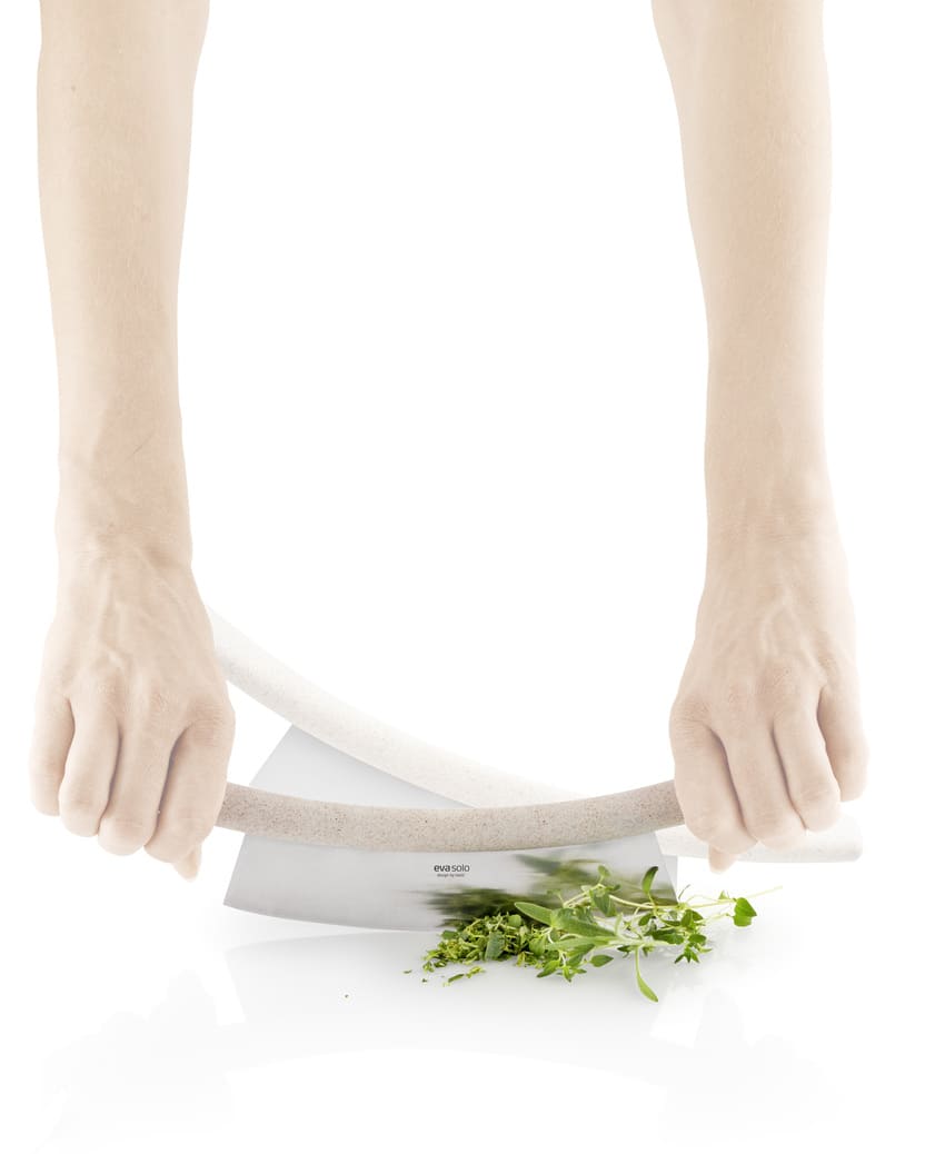 Este cuchillo funcional en forma de media luna facilita el trabajo de cortar verduras. Simplemente mueva la hoja curva sobre las hierbas, por ejemplo. El cuchillo tiene un mango sólido y cómodo en cada extremo.