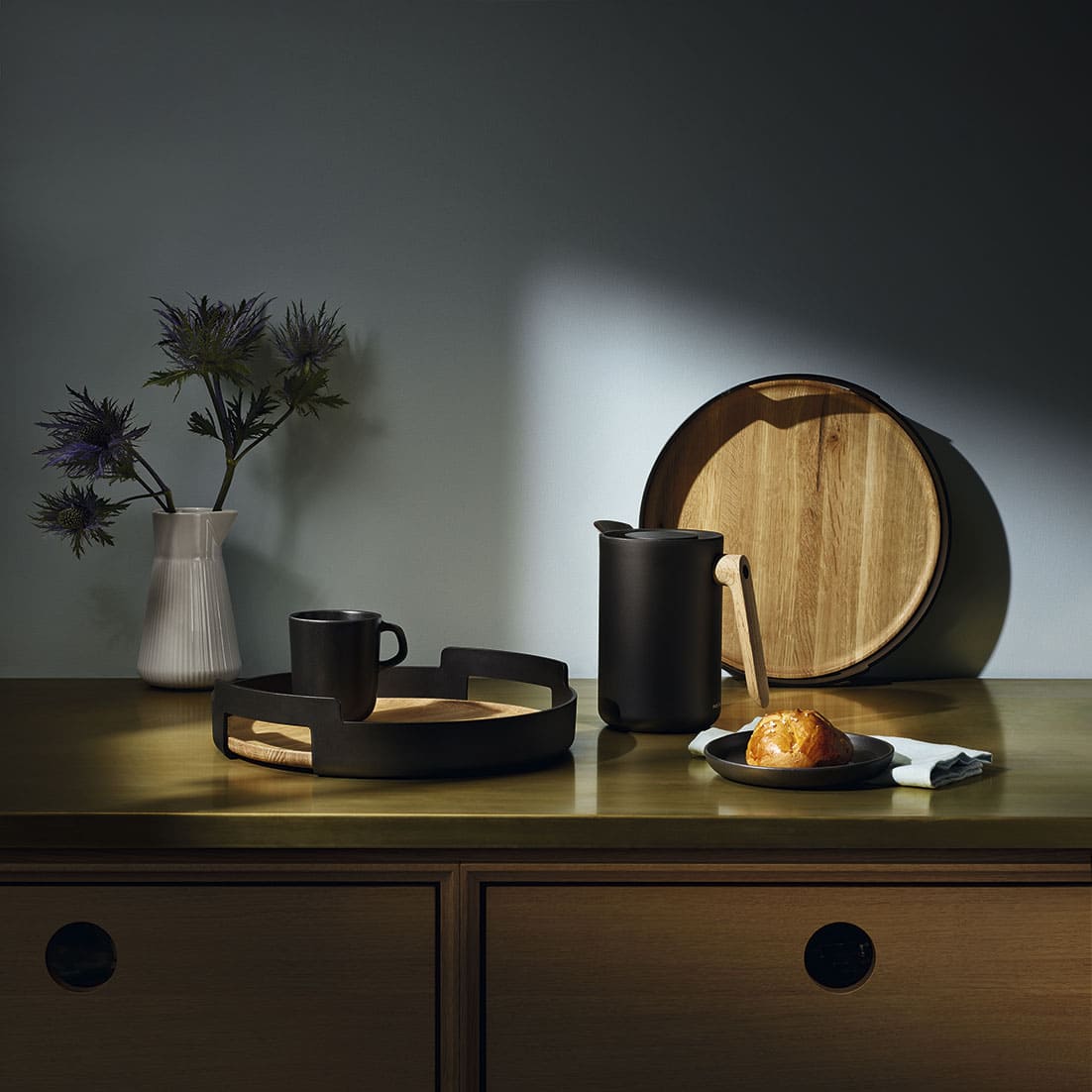 La bandeja de servicio "COCINA NÓRDICA" tiene un diseño elegante y exclusivo. Este tiene lados altos, que sostienen asas resistentes y aseguran un fácil manejo. Sirva café, bebidas o desayuno con estilo.
