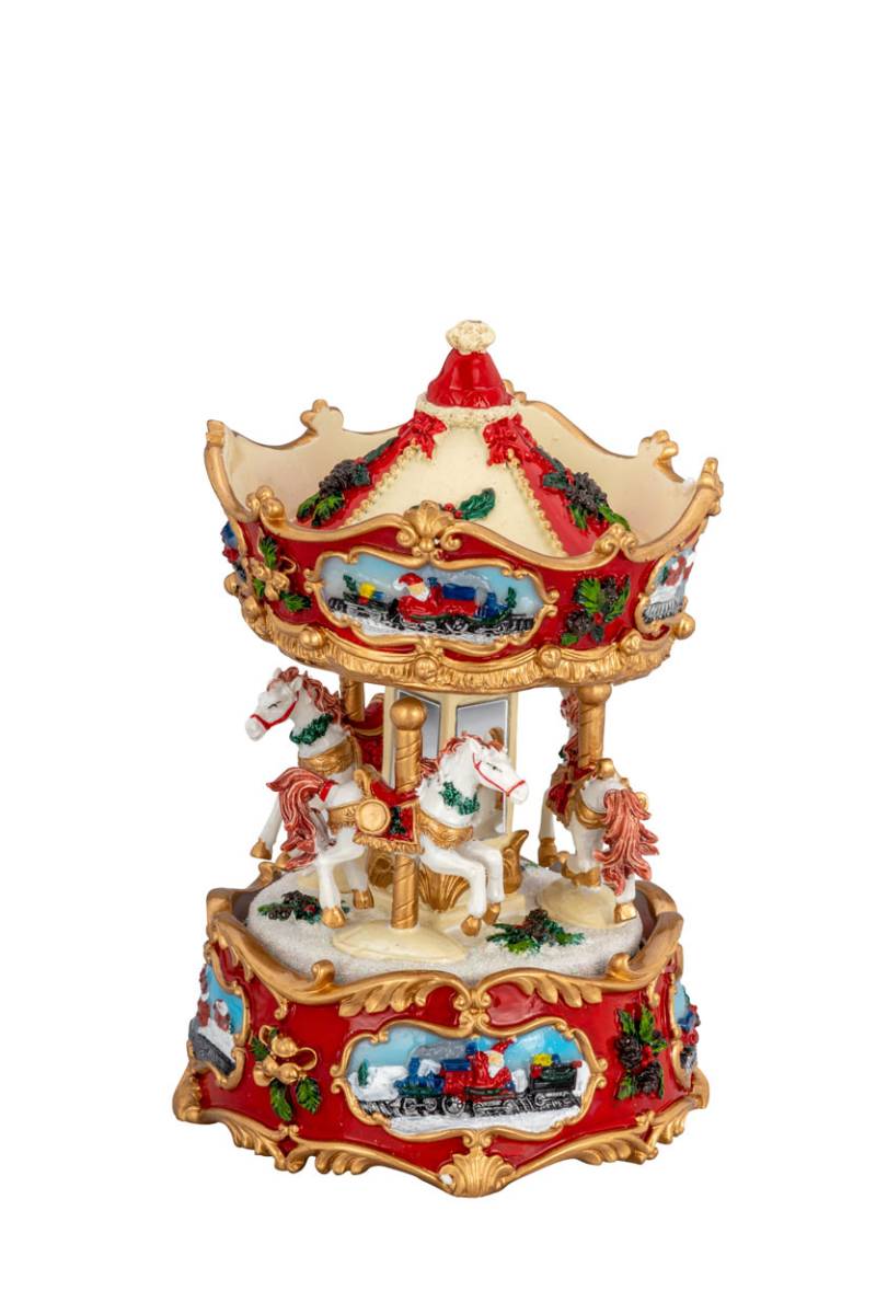 Uma adição simples, mas elegante, para qualquer espaço da sua casa. Este carrossel apresenta tr~es cavalos que giram ao som de “Jingle Bells”. O seu design compacto torna-o perfeito para ser exibido em qualquer lado. Gire e deixe que esta peça o transporte instantaneamente de volta aos tempos mais simples. Basta ouvir as suas notas familiares que este elevará o seu humor até mesmo nos dias mais entediantes.