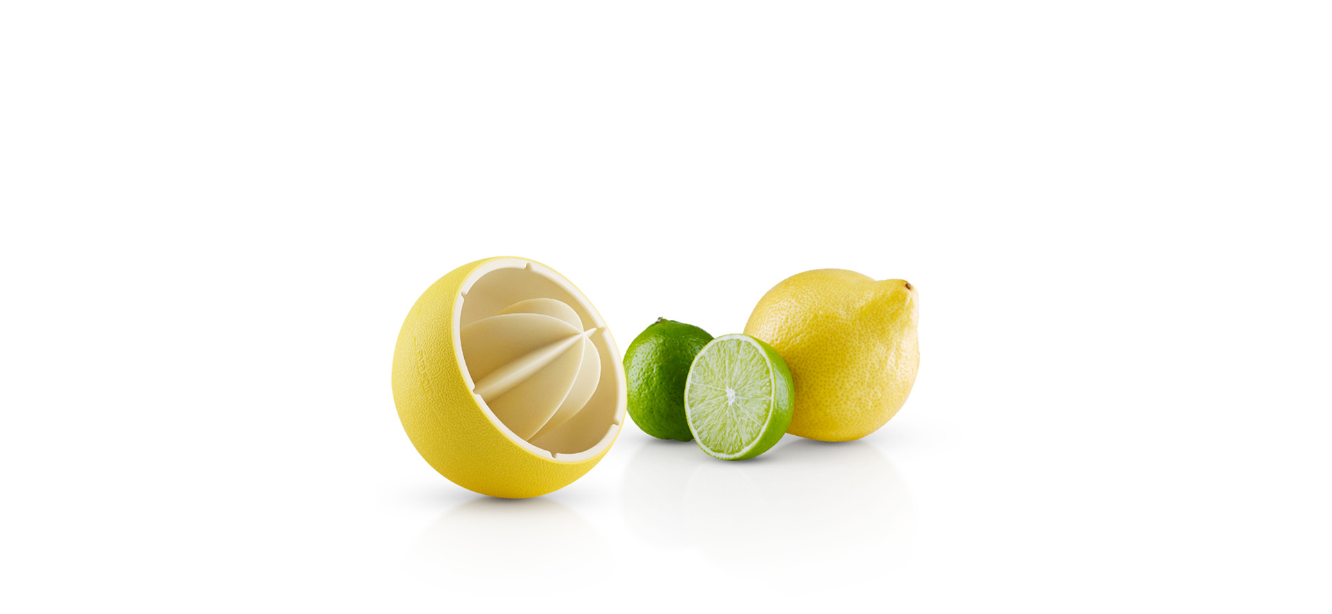 O espremedor de citrinos tem uma superfície rugosa, permitindo maior firmesa ao espremer o fruto. O bordo foi desenhado de modo que a reter as sementes quando virar o sumo para um copo.