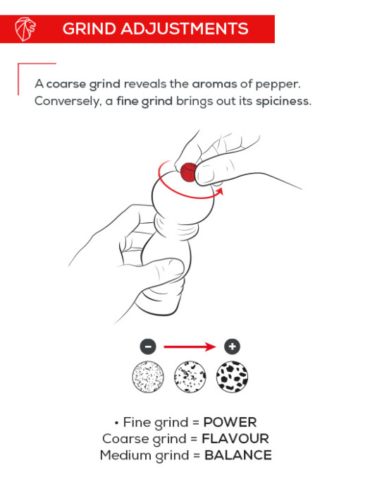 Adequado para pimentas pretas, brancas, vermelhas e rosas (aquando usadas em mistura com uma das anteriores) e grãos de coentros. Não utilizar grãos com mais de 6mm.