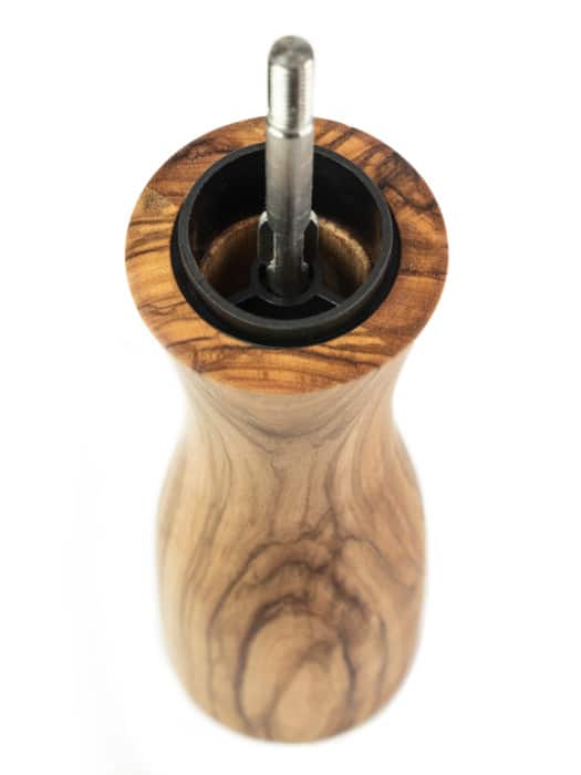 O moinho de pimenta “FIDJI” em madeira de oliveira é um tributo à natureza. A oliveira, nobre e robusta, tem uma longevidade excepcional e revela naturalmente as suas “veias”. Com um visual puro e um corpo em forma de uma abelha este oferece um toque suave e aveludado. Cada moinho é moldado a partir de um único tronco de madeira, o que os torna únicos e o seu topo em inox acrescenta um toque sofisticado. O seu botão permite-lhe ajustar o tipo de moagem, podendo obter uma moagem fina, que revelará a picância, e uma moagem grossa, que revelará os seus aromas. A qualidade dos materiais, a sua linha impecável e simples e o seu desempenho no uso tornam-no num utensílio não só magnífico como útil e durável, para além de apresentar um equilíbrio perfeito entre o calor da madeira de oliveira e do brilho do inox.