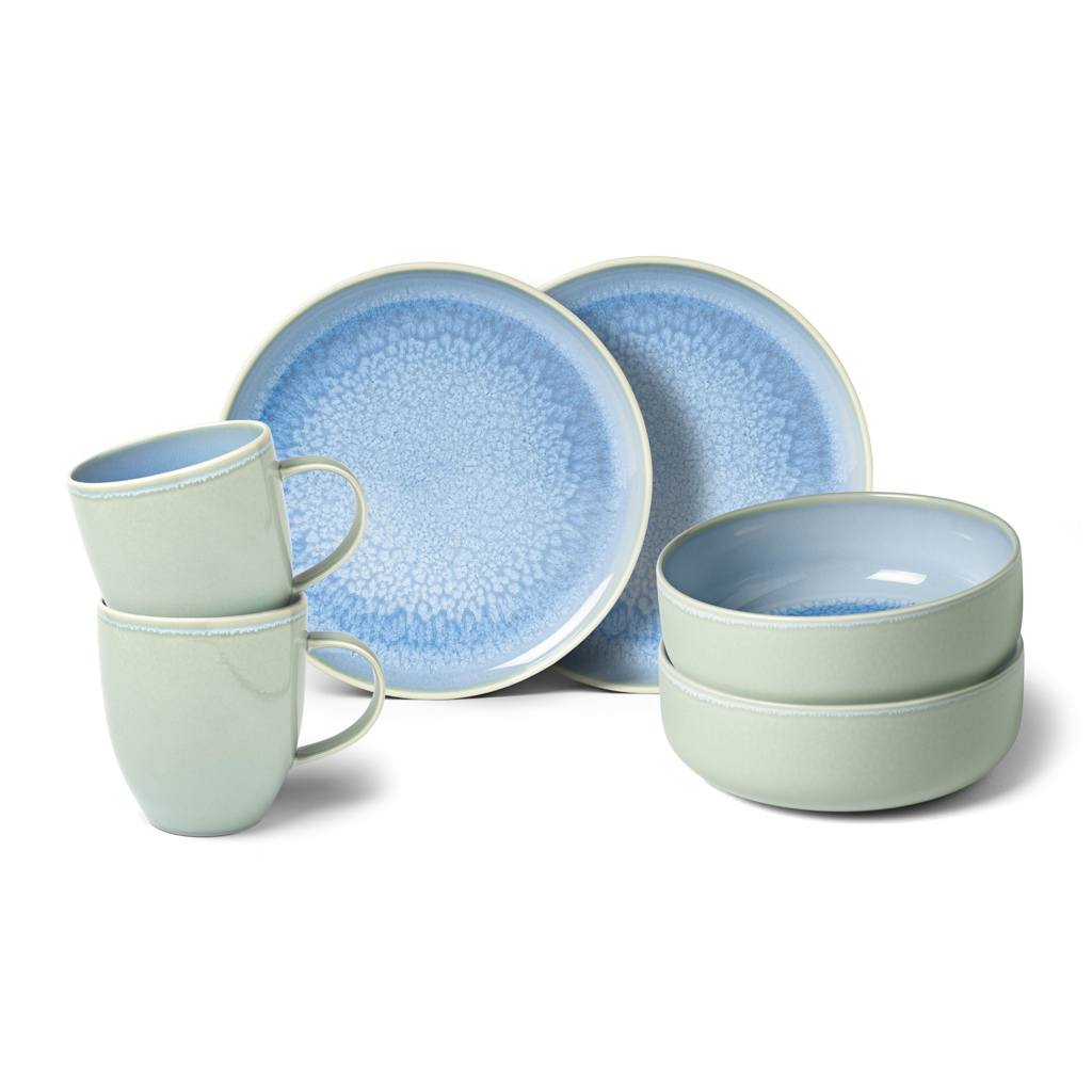 Este inclui dois pratos de pequeno almoço ideais para servir as suas refeições matinais, duas tigelas perfeitas para cereais, frutas ou iogurtes, e duas canecas para saborear o seu café, leite ou chá preferido. Cada peça é cuidadosamente finalizada com um esmalte reativo especial, de forma a conferir um toque artesanal único e a promover a individualidade e a criatividade à mesa.